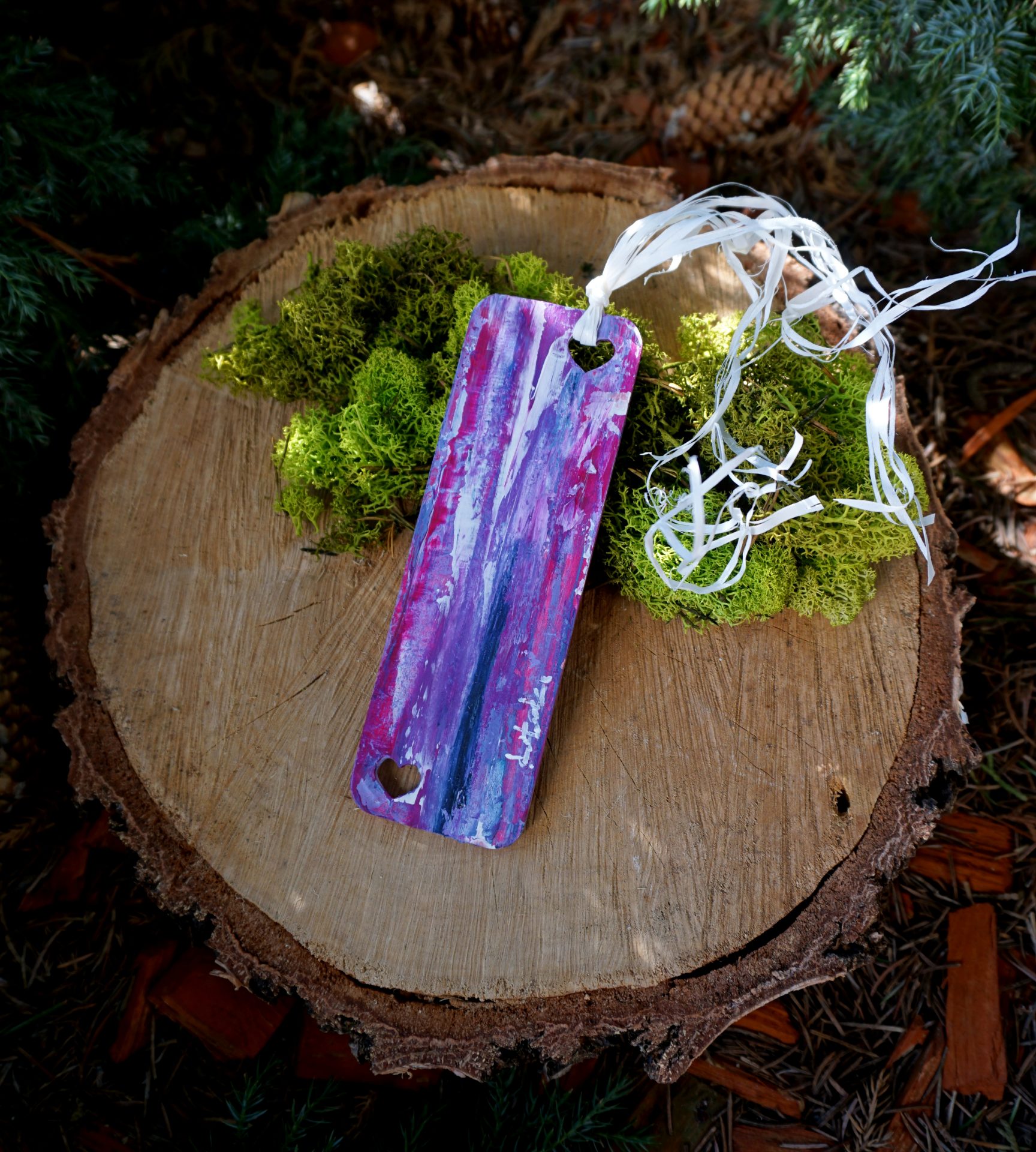 Drewniana, artystyczna zakładka do książki w formacie 15cmx5cm. Malowana obustronnie szpachelką, farbami akrylowi. Jedyna w swoim rodzaju, podpisana sygnaturą autora. Może stanowić wyjątkowy prezent dla osoby lubiącej sztukę.