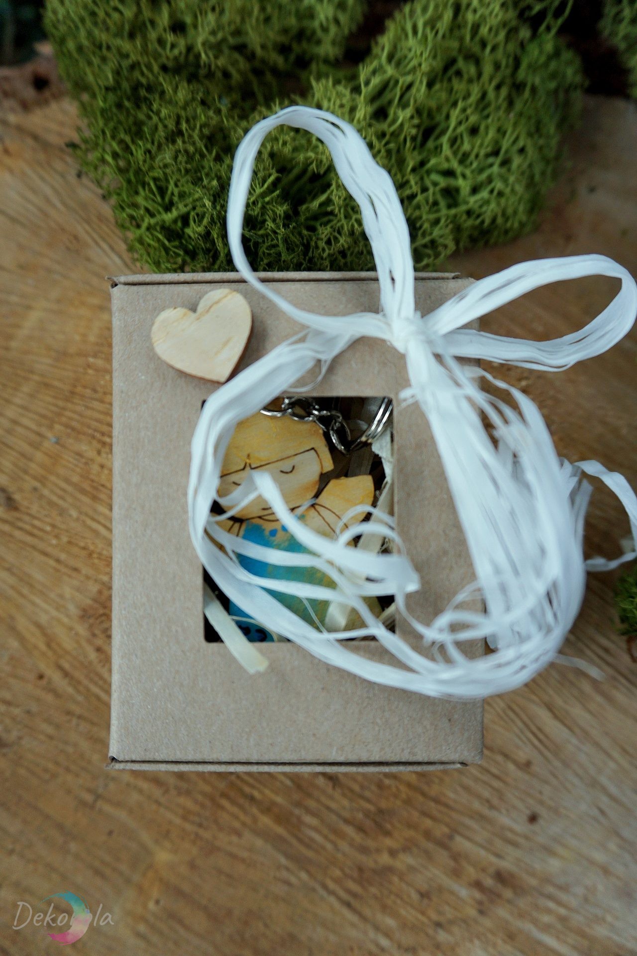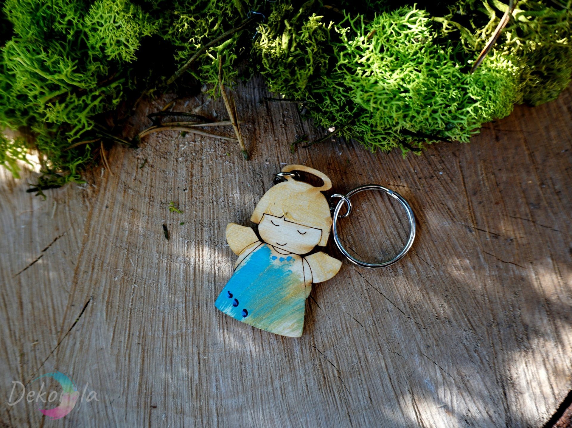 Mały drewniany breloczek malowany subtelnie farbami niebieską i złotą. Może stanowić ciekawe podziękowanie dla gości lub miły dodatek do prezentu.