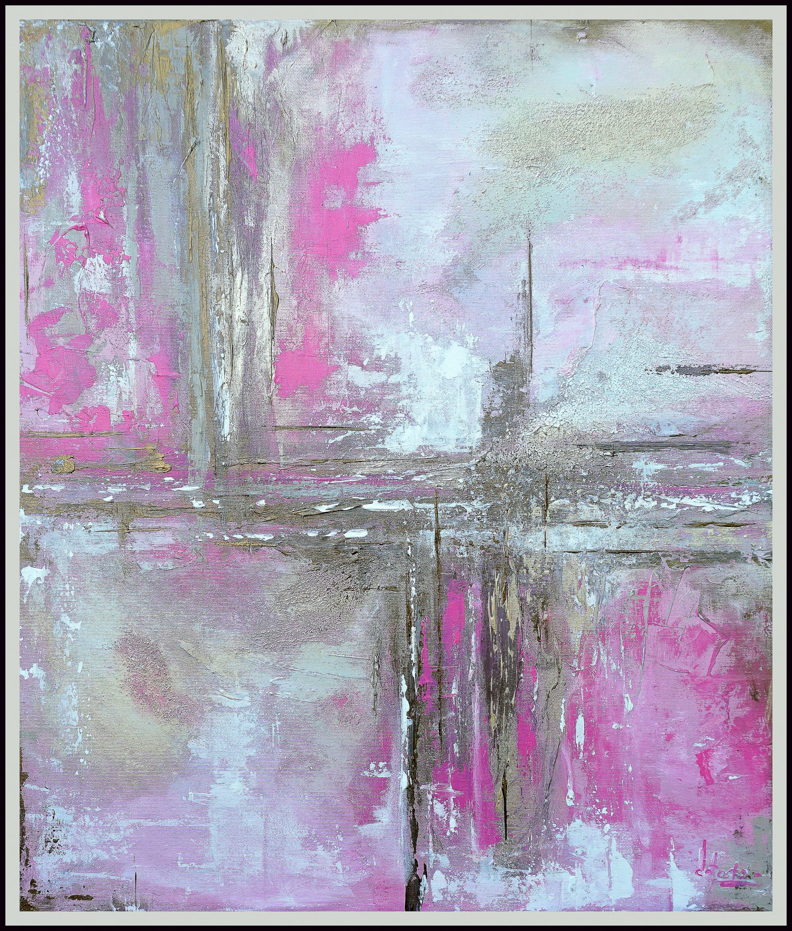 Ciekawy obraz, malowany na wysokiej jakości płótnie w formacie 50×60. Obraz namalowany został z użyciem masy strukturalnej, dzięki czemu ma mocno wypukłą strukturę. Boki obraz są pomalowane, nie wymaga on oprawy. Praca jest sygnowana. Do malowania zostały użyte farby wysokiej jakości w tym także farby złote, mieniące się. Do obrazu dołączy jest certyfikat autentyczności.